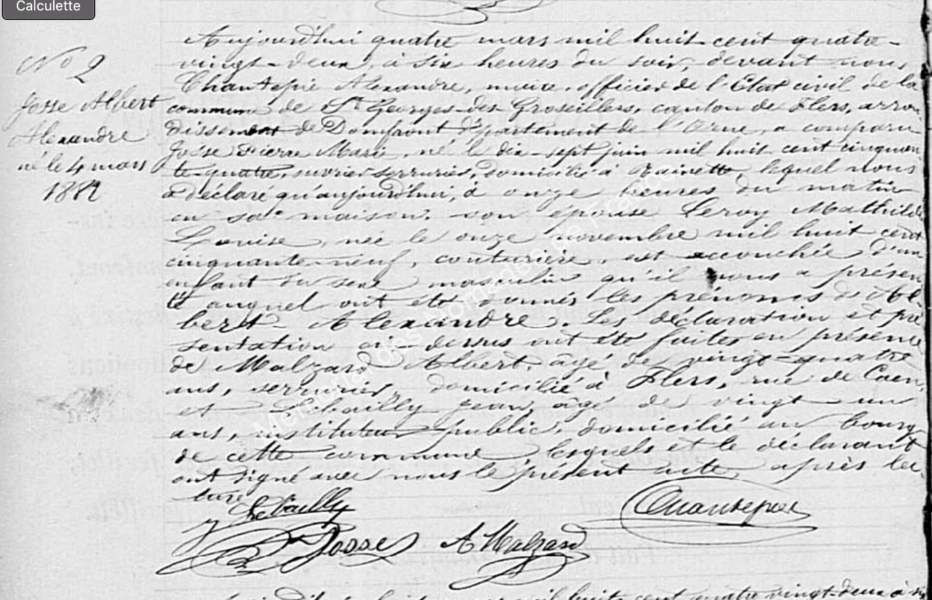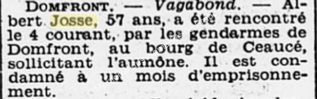 Né à Saint-Georges-des-Groseillers (Orne) le 4 mars 1882 à 11 heures du matin, fils de Pierre, Marie, JOSSE (17/06/1854), ouvrier serrurier, domicilié à Rainette [?] et de Mathilde, Louise, LEROY, couturière (11/11/1859), ouvrier menuisier, sait lire et écrire, catholique, français.