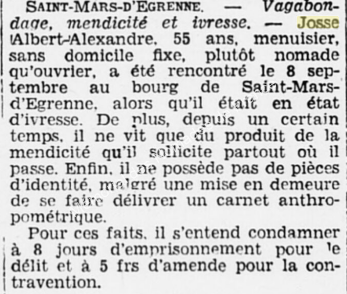 Condamné à 8 jours d’emprisonnement pour ivresse, vagabondage et mendicité en juin 1937, sous la menace de l’attribution d’un carnet anthropométrique. Condamné à un mois d’emprisonnement par le tribunal correctionnel de Domfront en février 1940 pour vagabondage. Réside à Cabourg (Calvados) en 1941.