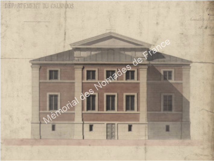 FRAD014, CPL/1334/22. Pont-Lévêque_tribunal. Plan d’élévation de la façade par Marcotte (1862). 1505W/5_Pont-L’Evêque_registres d’écrous et du bagne 1940-1943.
