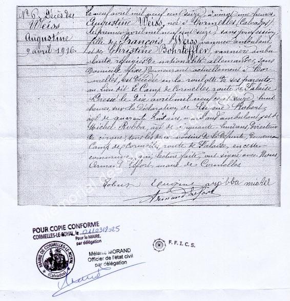 Décédée en la roulotte de ses parents, au lieu dit le Camp de Cormelles (Calvados), route de Falaise, le 09 avril 1916, âgée de 8 jours, sur déclaration de Eugène ROBERT, 48 ans, marchand ambulant et de Michel ROBBA, 58 ans, directeur de cirque, tous les deux voisins de la défunte.
