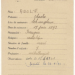 Né le 17 juin 1873 à Schweighausen (Bas-Rhin, Schweighouse-sur-Moder depuis 1949), fils de [Georges?] ADOLF, époux de Barbara WEISS (1886), Français, manœuvre
