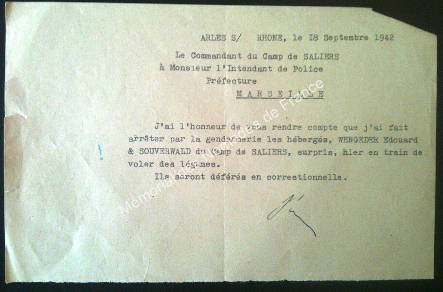 Interné au Camp d’Hébergement de Rivesaltes (Pyrénées-Orientales) le 18 juillet 1942 à 19 heures, matricule 15 296. Dirigé sur le camp de Saliers le 20 juillet 1942, n° de sortie 7 750 et 3 604, n° 21 dans le convoi.