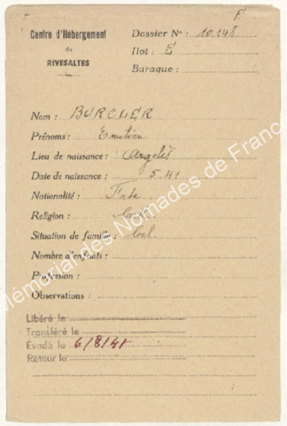 Mutée au Camp d’Hébergement de Rivesaltes (Pyrénées-Orientales), îlot F, le 20 juin 1941, matricule 10199, où elle est séparée de son père. Elle prend part à l’évasion organisée par son père le 06 août 1941 avec la complicité des gardiens. Ils ont fuit à travers les vignes et sont revenus à Pamiers à Pied où elle a fait sa scolarité.