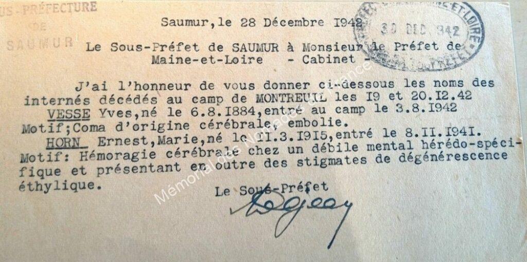 Interné au camp de Nomades de Montreuil-Bellay (Maine-et-Loire) le 09 novembre 1941