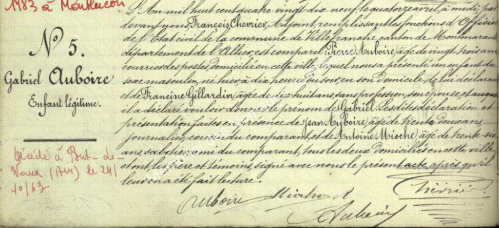 Né le 13 avril 1899 à Villefranche (Allier). Fils de Pierre AUBOIRE, 23 ans, (1875 † 1940), courrier des postes puis employé à l’imprimerie du journal Le Progrès de l’Allier, et de Francine GILLARDIN, 18 ans, ménagère. Frère de Éliane AUBOIRE, également militante.