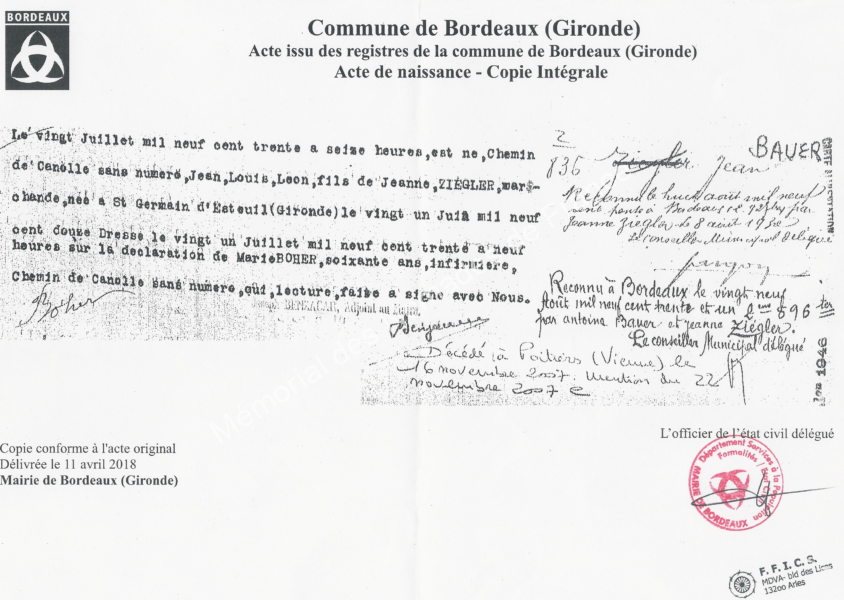 Né à Bordeaux (Gironde), chemin de Canolle, sans numéro, le 20 juillet 1930 à 16 heures, fils de Antoine « Sacotte » BAUER (1910, déporté depuis le camp de Poitiers au KL Oranienburg-Sachsenhausen) avec Jeanne Retcha ZIEGLER (21/06/191, Saint Germain d’Esteuil), reconnu par sa mère à Bordeaux (Gironde) le 08 août 1930, reconnu par ses parents à Bordeaux le 29 août 1931, frère de Rose Marie Rosette BAUER (12/12/1931, Le Bouscat, Gironde), Louis BAUER (13/11/1938, Langoiran, Gironde), Marina Nenene BAUER, Français, célibataire, vannier, catholique, Nomade.
