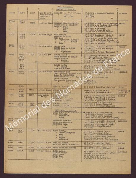 Interné au Camp de Mérignac-Beaudésert (Gironde) à l’automne 1940, groupe 9, n° 04 sur ordre de la Feldkomandentur allemande, sans arrêté, cause : Nomade.