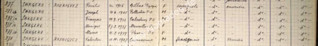 AD Pyrénées-Orientales, FRAD066, 109 W 322, Dossiers individuels Sargiro Rosario et Sargero Valentin, François, Joseph, Dominique, Marie ; 1260 W 88, sorties Rivesaltes; 1260 W 76, entrées Barcarès, 1941-1942.