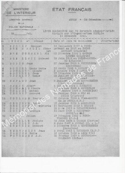 Archives Départementales de Haute-Vienne, FRAD087, Fonds de la Direction Régionale des Renseignements Généraux : TT1 Camp de Nexon-fiches d’internés (1942-1944) (1621 W 10-11-12), Organisation Todt liste nominative d’internés à Nexon-1943 (1621 W 58)