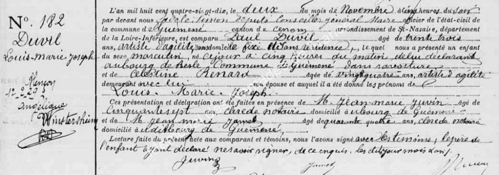 Né à Guémené-Penfao (Loire-Atlantique), au bourg de Besles dans sa voiture, le 02/11/1890 à 5 heures du matin, fils de Paul « Lolimol » Marie Alcide DUVIL (22/01/1865, Laneuville-à-Rémy (Haute-Marne), artiste d’agilité, vannier ambulant, sans domicile fixe) et de Célestine « Notela » RENARD (26/01/1865, Sankt-Gallen (CH-) † Cérans-Foullertutre (Sarthe), 17/01/1934, gymnasiarque, artiste d’agilité, vannière ambulante), marié à Alençon (Orne), le 17 février 1929 à 16 heures, en mairie, avec Angélique WINTERSHEIM (1895-1959), domicilié rue de la Juiverie 16, dont Émile « Gitzili » DUVIL (1915-1945, Marolle-les-Braults), Jean DUVIL (1918-1950, Treignat), Albertine « Kesla » DUVIL (1921, Floirac), Marie Louise DUVIL (1923-2003, Le Lion-d’Angers), Michel « Memensch » DUVIL (1926, Beaumont-sur-Sarthe), Jeanne DUVIL (1930, Mazé), Paul DUVIL (1933, Jarzé), forain, vanniers ambulant, sans domicile fixe, Français, de « race : nomade », catholique.