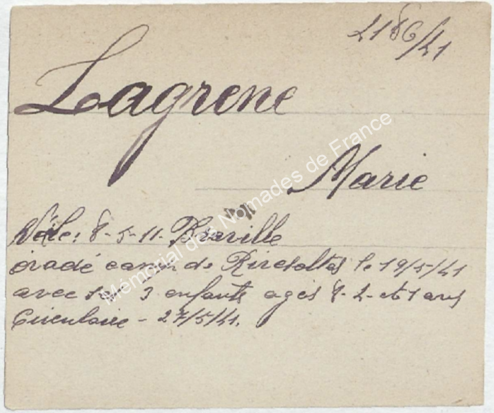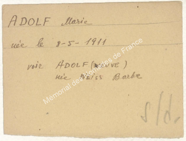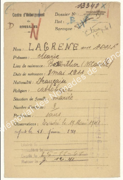 Née à Brauweiler (Brouviller, Moselle) le 08 mai 1911, fille de Charles ADOLF, vannier (17/06/1873, Schweighausen, Bas-Rhin † décédé le lundi 24 novembre 1941 au camp de Rivesaltes, Pyrénées Orientales, âgé de 68 ans) et de Barbe WEISS (15/07/1886), Française, Nomade, catholique, ménagère, mariée avec Charles LAGRENÉ (15/08/1914, Wolschwiller, Bas-Rhin), dont 3 enfants: René, Louis LAGRENÉ (26/08/1933, Strasbourg, Bas-Rhin), Lucien LAGRENÉ (14/01/1937, Phalsbourg, Moselle), Joseph LAGRENÉ (12/02/1940, Châteauroux, Indre)