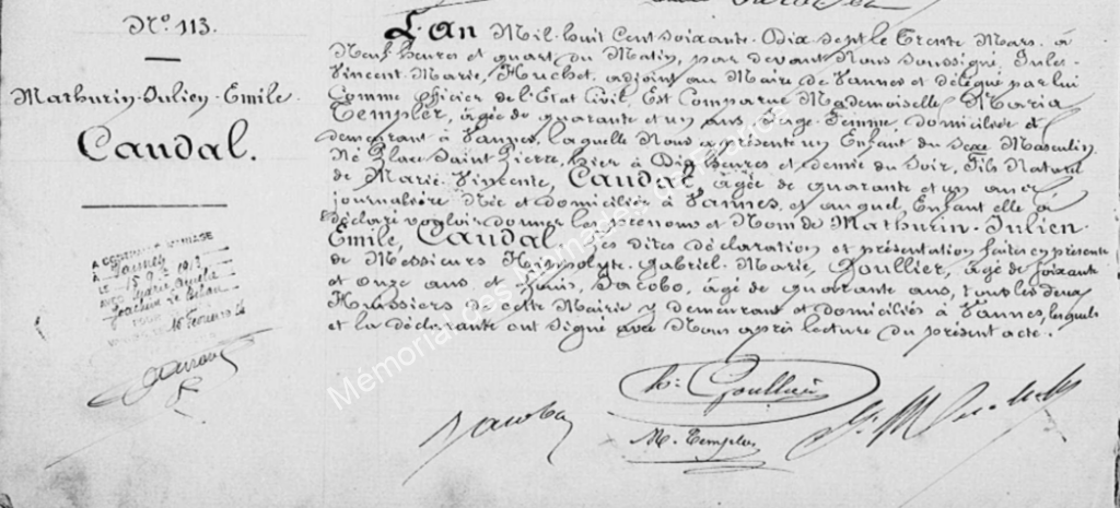 Né à Vannes (Morbihan), place Saint-Pierre, le 29 mars 1877, à dix heures et demi du soir, fils de Marie Vincente CANDAL, 41 ans, journalière ; couvreur. Marié à Vannes le 15 septembre 1913 avec Marie, Amélie, Joachim LE BIHAN, journalière, née à Vannes le 5 juillet 1883 (présente au camp).