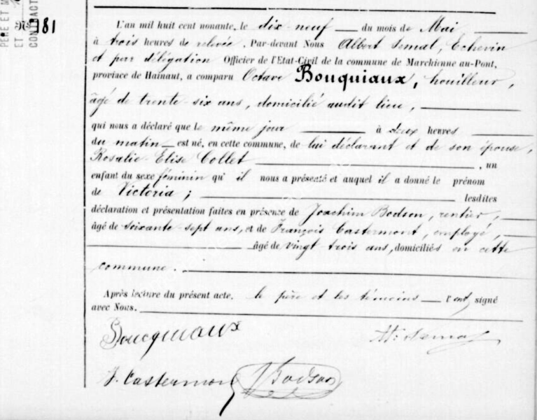 Archive de l’État de Belgique-province de Hainaut- Marchienne-au-Pont – acte Naissance 181- page 90; acte de mariage, 1912.