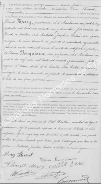 Née à Marchienne-au-Pont, province du Hainaut, région de Wallonie, Belgique, le 19 mai 1890, à 2 heures, fille de Octave BOUQUIAUX, houilleur belge (1854 † Marchienne-au-Pont, 14/01/1905) et de Rosalie, Élise, COLLET, ménagère belge (1858). Carnet anthropométrique individuel Nomades n° 51 909, délivré en 1927 à Mézières, Ardennes. Elle a trois demi-frères d’un premier lit, et est la sœur de Irma BOUQUIAUX (1887), et de Marie Henriette BOUQUIAUX (03/07/1892, Marchienne-au-Pont † idem, chemin Saint Charles 5, 10/01/1893). Mariée avec Marchienne-au-Pont le 15 juin 1912 avec Florent MERCY, artiste dramatique, pontonnier (12/09/1891, Marchienne-au-Pont, Belgique, carnet anthropométrique n° 51 908, délivré en 1927 à Mézières, Ardennes ; fils de Florent MERCY et de Mathilde Joséphine LARDIN), dont François, Florent, MERCY, sans profession, nationalité Belge (30/05/1913, Marchienne-au-Pont, Belgique ; carnet anthropométrique n° 51 910, délivré en 1927 à Mézières, Ardennes)
